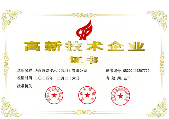 根據(jù)國家《高新技術(shù)企業(yè)認(rèn)定管理辦法》和《高新技術(shù)企業(yè)認(rèn)定管理工作指引》的有關(guān)規(guī)定,華謀咨詢技術(shù)(深圳)有限公司憑借團(tuán)隊(duì)專業(yè)技術(shù)研發(fā)能力、持續(xù)創(chuàng)新能力和企業(yè)管理能力,順利通過由科技部、財(cái)政部、稅務(wù)總局組織的國家高新技術(shù)企業(yè)認(rèn)定,目前,華謀咨詢技術(shù)(深圳)有限公司是國內(nèi)管理咨詢領(lǐng)域內(nèi)獲得國家高新技術(shù)企業(yè)認(rèn)證的企業(yè)。